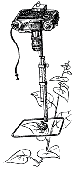 Отличный инструмент для макросъемок насекомых придумал профессор П. И. Мариковский — я успешно пользуюсь им много лет. В старый «Фотокор» вместо кассеты вставлена пластина, в центре ее — муфта с резьбой, куда ввертывается «Зенит» без объектива. Растяжением меха достигаем любого увеличения, а со сжатым мехом «Фотокор» работает как телеобъектив к «Зениту». При сильных увеличениях без привычки трудновато поймать в визир нужный живой объект, одновременно добиваясь резкости наклонами туловища, поэтому, чтобы «набить руку», потренируйтесь на каких-нибудь домашних предметах. При сильных увеличениях экспозиции более 1/125 секунды нежелательны: от движения трав ветром, собственных движений насекомого, дрожания рук может получиться «смазь».