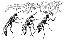 Задания. Перед вами — схематические рисунки трех ос, вернее, «обобществленные портреты» одиноких ос трех групп (в каждой из групп — множество видов): слева песчаная оса аммофила, в центре — сфекс, справа — дорожная оса помпил. Аммофилы заготавливают для своих детей гусениц, отлавливая их и парализуя; сфексы — кобылок (а те, что покрупнее, — кузнечиков и сверчков), помпилы охотятся на пауков — тоже разных размеров, в зависимости от своего роста.