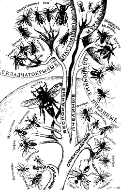 Место аммофил, сфексов, помпилов в «Родословном древе подотряда жалящих перепончатокрылых», выполненного мною для книги И. А. Халифмана «Четырехкрылые корсары» про ос.