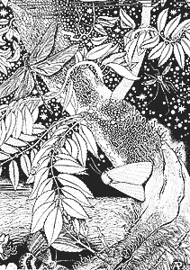 Бумажные макеты бабочек, поддуваемые вентилятором, "порхают" совершенно натурально. Моторчик расписан "под растения", и потому незаметен. Ближнюю берёзку приходится изображать на всех пяти ярусах притом буквально до листика.