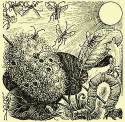 наездники-бракониды, съев гусеницу, выходят из коконов; жужелицы разных видов;