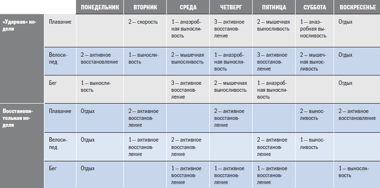 В табл. 14.5 приведен пример ударного цикла для триатлета. Помните, что это всего лишь один из способов, которыми может быть организован подобный цикл.