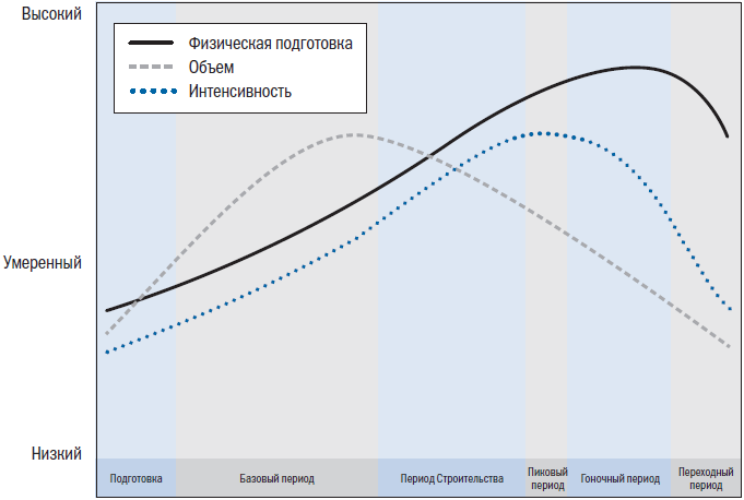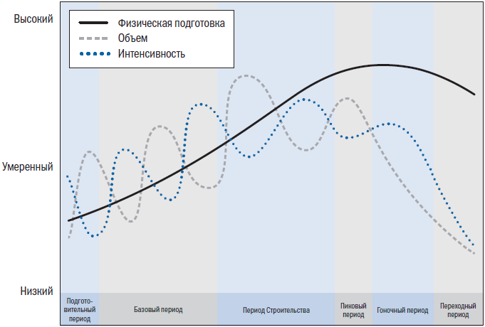 Рис. 3.6 показывает, как работает модель волнообразной периодизации. По сути, в ходе сезона объем и интенсивность поочередно растут и снижаются. К примеру, спортсмен может совмещать в течение одной недели значительный объем катания на велосипеде с бегом с высокой интенсивностью, а на следующей неделе – пробегать большую дистанцию с небольшой интенсивностью, при этом повысив интенсивность велосипедных тренировок. Это разнообразие помогает поддерживать мотивацию. Как показал ряд исследований, тяжелоатлеты, использующие такую модель, показывают значительное улучшение с точки зрения силовых результатов. Однако в отношении видов спорта, связанных с выносливостью, подобных исследований не проводилось.