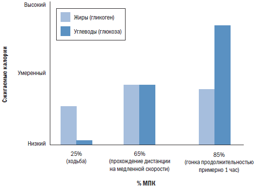 Жиры являются основным источником топлива при низком уровне усилий, например при долгой медленной езде на велосипеде. По мере нарастания интенсивности упражнений организм все чаще начинает обращаться за топливом к углеводам, и использование жиров для этой цели уменьшается (см. рис. 4.1). Углеводы хранятся в мышцах и печени в виде гликогена, а также в крови в виде глюкозы. В каждый отдельно взятый момент времени в распоряжении спортсмена имеется от 1500 до 2000 калорий в составе гликогена и глюкозы, при этом порядка 75 % этих запасов находится в мышцах (точное количество калорий зависит от размеров тела и уровня физической подготовки). Участвуя в гонке на олимпийскую дистанцию (плавание 1500 метров, велогонка 40 километров, бег 10 километров), триатлет может сжигать до 1000 и более калорий в час, и примерно 650 из них будут поступать из углеводов. Легко заметить, что при таком уровне нагрузки внутренние запасы глюкозы и гликогена могут истощиться до того, как спортсмен пересечет финишную черту. Если он не пополнит запасы в ходе гонки с помощью спортивного напитка, то, скорее всего, сойдет с дистанции еще до финиша.
