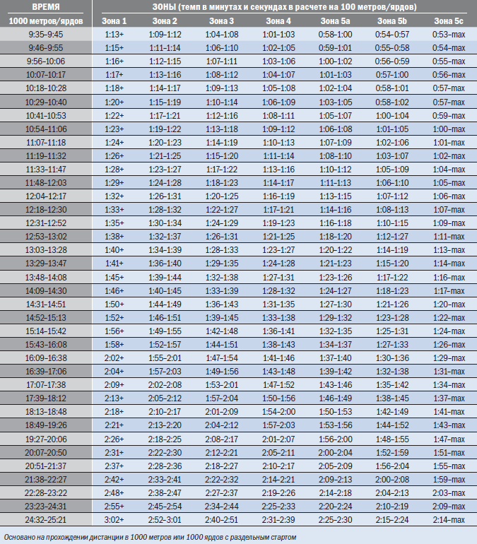 В «старые времена» триатлона (примерно в 1980 году) тренировки в области интенсивности базировались в основном на темпе. В наши времена темпу уделяется значительно меньше внимания. И это плохо, так как темп остается эффективным показателем, позволяющим получить полезную информацию. Для опытных спортсменов это по-прежнему лучший критерий оценки интенсивности при плавании; с точки зрения езды на велосипеде его преимущества значительно ниже. В табл. 4.1 и 4.2 указаны стандарты времени для плавания и бега для семи описанных выше тренировочных зон.