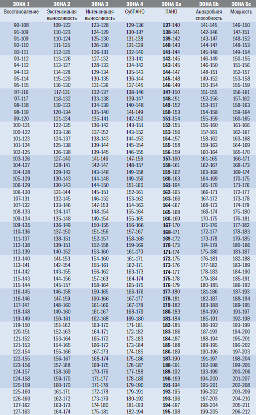 Так же, как и в других способах измерения интенсивности (о которых мы говорили выше), тренировочные зоны, основанные на частоте пульса, могут быть привязаны к стандартным значениям ПАНО. Часто для его оценки используется максимум ЧСС, но этот метод имеет ряд недостатков. Во-первых, попытка добиться максимального значения ЧСС для того или иного упражнения требует крайне высокой мотивации. Кроме того, для некоторых спортсменов упражнения со столь высокой интенсивностью могут оказаться попросту опасными. Ваш истинный уровень ПАНО является наилучшим индикатором того, что происходит с вашим телом. Его значение может сильно колебаться у различных спортсменов. К примеру, пульс на уровне ПАНО у одного спортсмена может появляться при 85 % максимального уровня ЧСС. А у другого спортсмена это происходит при 92 %. Соответственно, если эти спортсмены тренируются на уровне 90 % от максимума, для одного из них тренировки являются анаэробными, и заниматься ими ему тяжело. Другой же спортсмен будет находиться в аэробной зоне и тренироваться без особенного напряжения. Использование процента от максимального значения ЧСС для определения целей того или иного упражнения является значительно менее точным методом, чем определение зон на основании пульса ПАНО. Последнее требует некоторых усилий, но это не должно вас отпугивать.