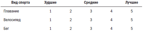 Начните с оценки своих навыков в области плавания, езды на велосипеде, бега с применением следующей шкалы. Ваша оценка для каждого вида спорта будет субъективной и основанной на рейтингах других спортсменов для определенных категорий гонок и возрастных групп. Оценка 5 означает, что вы находитесь в числе лучших, оценка 3 – что вы находитесь примерно в середине своей категории, а оценка 1 – что вы в самом низу.