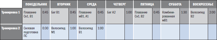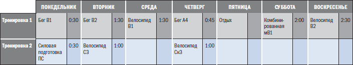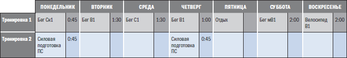 Обратите внимание на тот факт, что количество часов для обеих недель не совпадает с рекомендуемым, приведенным в табл. 8.1. Это отклонение от нормальной программы тренировок было сделано для того, чтобы совместить ее с рабочим графиком Д. М.