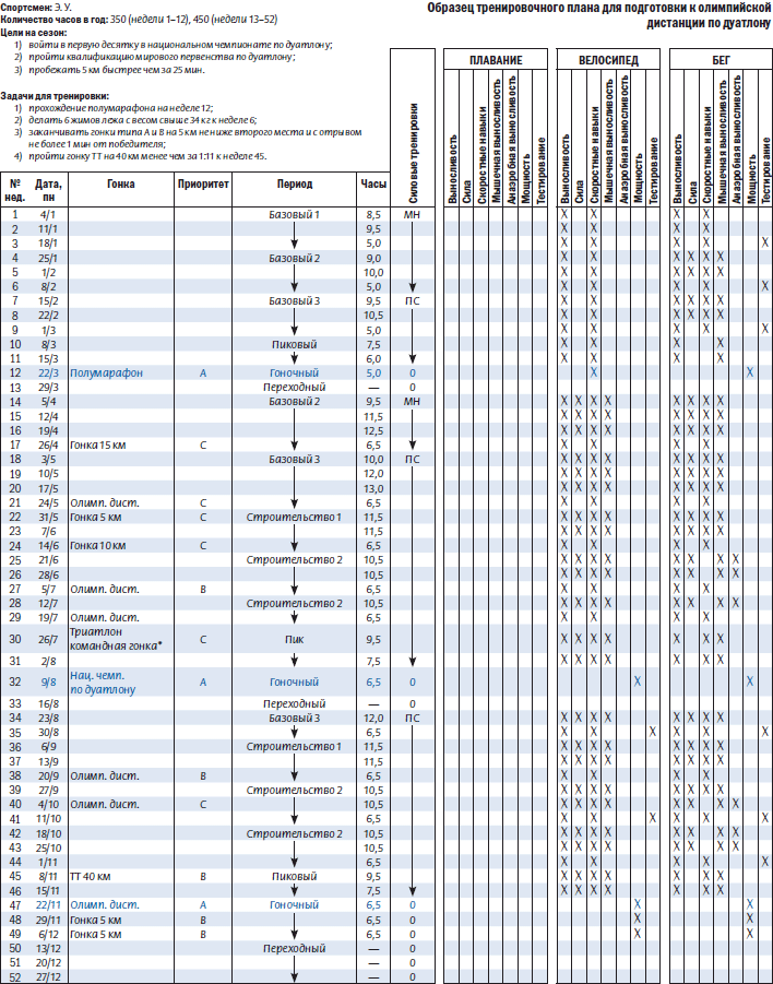 Табл. 9.2 (описания упражнений, обозначенных аббревиатурами, см. в Приложениях B – E) иллюстрирует проблему, с которой часто сталкиваются спортсмены, работающие над повышением своей выносливости: неделя упражнений с высокой интенсивностью следует после недели, в ходе которой проводится гонка. Попытки заняться в четверг беговыми упражнениями, связанными с анаэробной выносливостью, значительно повышают для Д. М. риск получения травмы на неделе 39. Именно поэтому его занятия на трассе переносятся на четверг, а упражнения на велосипеде с высокой интенсивностью запланированы на вторник. Сессия на велосипеде, проводимая во вторник, направлена на развитие мощности. Начав работу над этим упражнением, Д. М. может по мере выполнения оценить свою способность довести его до конца. Если он почувствует, что еще не до конца оправился от предыдущих нагрузок и не может чувствовать себя безопасно при высокой мощности движений, он легко переключится в зону 1 на все оставшееся до конца часа время.