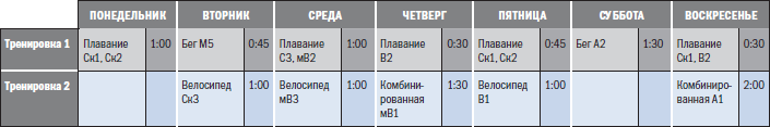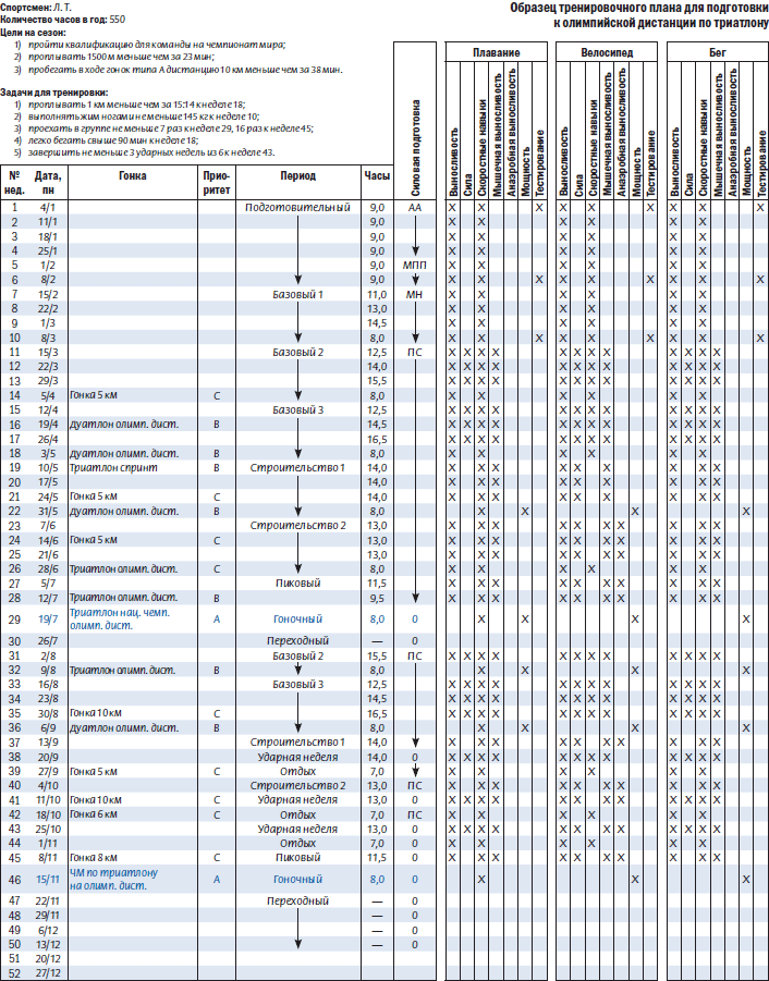 Распределение часов занятий (см. табл. 8.1) было сделано таким образом, чтобы в максимальной степени удовлетворить потребности Л. Т. Неделя начинается в понедельник с упражнений с низкой интенсивностью, так как в предшествующую субботу спортсменка участвовала в гонке, и поэтому нет смысла начинать ударные занятия в состоянии усталости. Обратите внимание, что пятница также является восстановительным днем, в который Л. Т. полностью отказывается от упражнений. Это проявление осторожности после брика с акцентом на бег, проводимого в четверг, и бегом по холмам в субботу. Травмы при беге чаще всего возникают в ходе ударной недели, поэтому Л. Т. нужно будет серьезно оценить степень своего восстановления перед началом брика «велосипед-бег» в воскресенье. Упражнения по плаванию могут проводиться в нормальном режиме и выступать в качестве элемента восстановления.