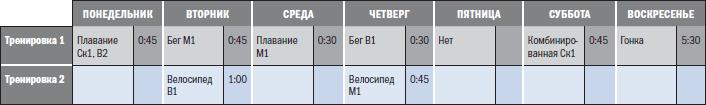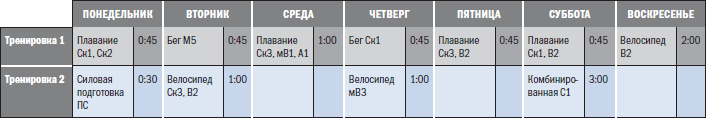 Время Дж. Х. на олимпийской дистанции составляет около 2:08. Если умножить этот показатель на коэффициент от 4,67 до 5,0, то его расчетное время прохождения Ironman окажется в пределах от 9:57 до 10:40, поэтому цель (10:30) выглядит вполне реальной. Дж. Х. рассчитывает в ходе предстоящей гонки проплыть этап за 1:05, проехать на велосипеде за 5:40, пробежать дистанцию за 3:35, ограничив при этом пребывание в транзитной зоне 10 минутами. Если предположить, что спортсмен замедлится на 20 % на беговом этапе (относительно лучшего результата обычного бегового марафона, составляющего у Дж. Х. 2:55), то он должен пробежать этот участок как раз за 3:35. Годовой план тренировок спортсмена, включающий в себя участие в марафоне на неделе 12, учитывает это.