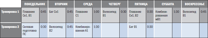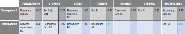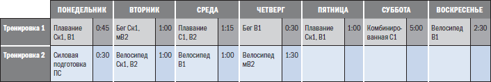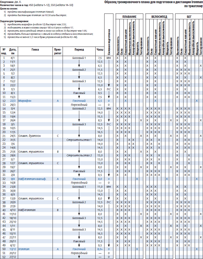 Готовясь к марафону в начале сезона, Дж. Х. будет посвящать основное время тренировок на неделях 1–12 бегу, при этом занятия плаванием и велосипедом будут носить поддерживающий характер. Так как тренировки по марафону не занимают столько времени, сколько тренировки по Ironman, то их объем для недель 1–12 составляет 450 часов, но начиная с недели 14 возрастает до 550 часов. После улучшения своей беговой выносливости, предполагая, что прохождение марафона будет удачным, Дж. Х. сместит акцент своих тренировок в сторону велосипеда, а беговая физическая подготовка будет носить вспомогательный характер.
