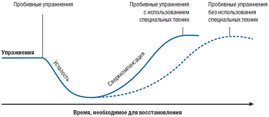 В течение шести-девяти часов после пробивных упражнений вам следует активно заниматься восстановлением с помощью одной или нескольких специальных техник. Самый простой метод – это сон. С точки зрения восстановления нет ничего лучше короткого сна, так как гормон роста начинает выбрасываться в организм порциями примерно через 30 минут после погружения в легкий сон. Помимо перерыва на сон после упражнений (30–60 минут) правильно организуйте свой ночной сон. Каждую ночь вам необходимо спать от семи до девяти часов. Существует масса индивидуальных методов восстановления – вам следует поэкспериментировать, чтобы понять, какие из них лучше всего подходят именно вам. Во врезке 11.1 «Техники восстановления» вашему вниманию предлагается несколько техник. Используя их, вы сможете ускорить процесс восстановления и быстрее вернуться к активной деятельности. На рис. 11.3 приведено графическое отображение этого процесса.