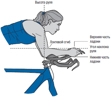При точно выверенной высоте руля относительно сиденья (или длине выноса) ваши уши будут находиться впереди локтей в горизонтальной плоскости. Правильность вашей посадки можно примерно оценить следующим образом: расстояние от переднего конца сиденья до задней оконечности руля должно быть на 2,5–4 сантиметра больше, чем расстояние от задней часть вашего локтя до кончиков вытянутых вперед пальцев.