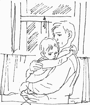 …Пообедали на скорую руку. Бабушка Настя ушла. Совсем стемнело. Коростелев звонил по телефону и прощался с кем-то. Сережа прислонился к его коленям и почти не двигался, — а Коростелев, разговаривая, перебирал его волосы своими длинными пальцами…