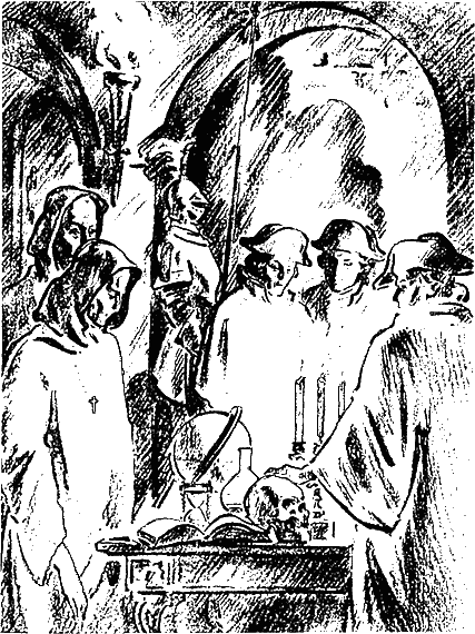 Обширная низкосводчатая комната полна была причудливых теней, бросаемых рыцарскими доспехами, скелетами, черепами, чучелами заморских птиц. Даже несколько высушенных и подвешенных к потолку крокодилов скалили многозубые пасти. Среди долгоносых стеклянных реторт, напоминавших чудовищ с картин, изображавших «искушение св. Антония», стояли две черные высокие фигуры в масках и перед ними, в большой шляпе, надвинутой на самые брови, гордо замкнутый Шрёпфер.