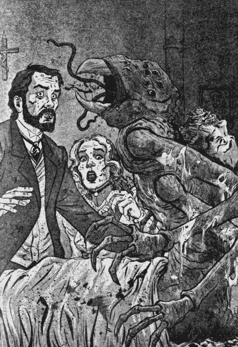 Все присутствовавшие в комнате застыли, пораженные увиденным. Николай Дмитрич в последний раз хрипло вскрикнул, а затем его голова неестественно завалилась назад. Остатки его тела были отброшены, словно ненужный более кокон: отброшены горбатым слюнявым чудовищем высотой более трех аршинов. Серо-зеленый монстр, стоявший на постели больного, был наделен десятком глаз, сгруппированных вокруг зубастой морды с кривым грязно-желтым клювом. Толстый чешуйчатый хвост развернулся на всю комнату, в то время как четыре короткие лапки, на каждой из которых было по три когтя, замахали во все стороны.