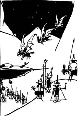 Все это произвело ошеломляющее впечатление на соединенное войско трех царств. Всадники, не мешкая, развернули своих летающих ослов и скоро рассеялись вдали. А пехота, побросав в панике оружие, смешавшись и потеряв строй, бросилась бежать, куда глаза глядят. Чтобы собрать их в одну кучу, Ян Бибиян стал кружить над ними, сгоняя, точно чабан овец.