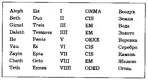 – Девять гравюр, или девять врат. – Снова тень, словно маска закрыла его лицо. – И не всякому они отворятся… «Каждая дверь имеет два ключа», каждая гравюра дает цифру, магический элемент и слово-ключ – если взглянуть на все это в свете разума, Каббалы, оккультного искусства, истинной философии… Латынь в сочетаниях с греческим и древнееврейским. – Он показал Корсо лист, заполненный какими-то значками и странными сопоставлениями. – Взгляните-ка, ежели желаете. Вам бы никогда в этом не разобраться: