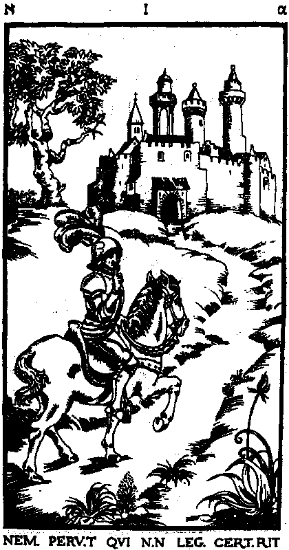 I. NEM. PERV. T QUI N. N LEG. CERT. RIT: Рыцарь скачет к окруженному зубчатой стеной городу. Прижатый к губам палец – призыв к осторожности и молчанию.