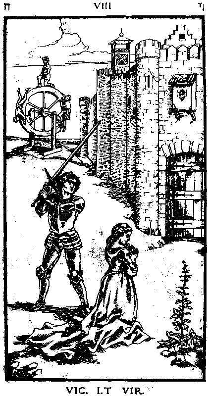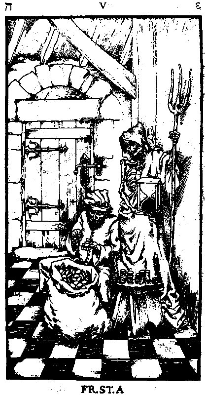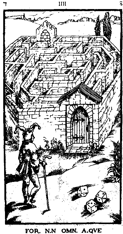 IIII. (Латинская цифра написана именно таким образом, а не как обычно – IV). FOR. N. N OMN. A. QUE: Шут перед каменным лабиринтом. Вход в лабиринт тоже прегражден запертой дверью. На полу три игральных кости – у каждой видны сразу три грани, соответствующие цифрам 1, 2 и 3.