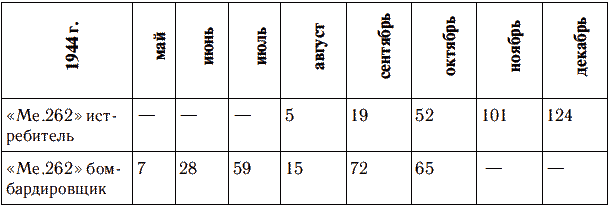 Хорошо видно, что первоначально действительно большая часть выпуска «Ме.262» шла в бомбардировочном варианте. Это, впрочем, не отменяет того факта, что в Испытательной команде 262 были сконцентрированы истребители. Из 84 «Ме.262», имевшихся в наличии на 10 августа 1944 г., 33 самолета принадлежали I группе 51-й бомбардировочной эскадры, 15 — «Испытательной команде 262», 14 — испытательному центру в Рехлине, 11 — испытания на фирме Мессершмитта, 1 — на фирме «Юнкерс» для испытания двигателей и, наконец, 10 — на переделке в двухместные на «Блом и Фосс».