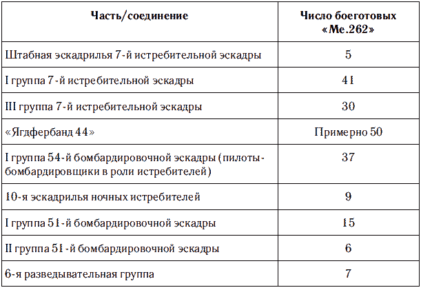 Ярче всего демонстрирует реальную эффективность «Ме.262» как средства ПВО наиболее массированное применение реактивного истребителя за всю историю его использования. На 9 апреля 1945 г. в распоряжении немцев было около двухсот боеспособных «Ме.262». Распределялись они (табл. 6) [164] :