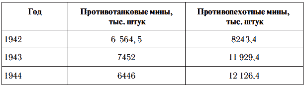 Что характерно, в 1944–1945 гг., когда Красная Армия вела масштабные наступательные операции, производство противотанковых мин уменьшилось незначительно, а противопехотных даже выросло. (Таблица 5.)