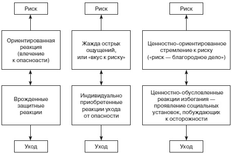 То, что понятия «склонность к риску» и «готовность к риску» используются как синонимы, мне представляется ошибочным: готовность к риску – это не личностная диспозиция, т. е. склонность к риску, стремление к опасности (которое лишь облегчает принятие риска), а интеллектуально-волевое состояние «здесь и сейчас». Это понимание ситуации как рискованной и принятие риска (готовность пойти на риск с учетом своих возможностей). [17]