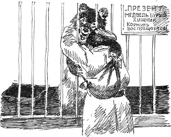 — А это медведь обыкновенный, — сказал кто-то, и конопатые носы пионеров повернулись в сторону Презента. Медведь встал, походил по клетке. Он сильно вырос, но шерсть его утратила прежний блеск, а походка — веселость. Он повернулся к экскурсантам и стал качать головой из стороны в сторону, выпрашивать подачку.