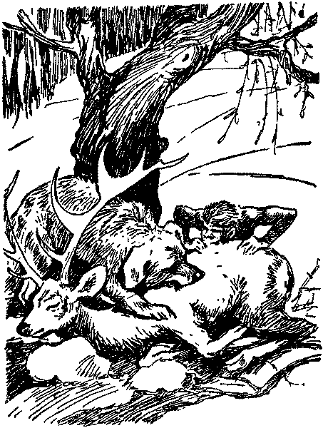 Вскоре река повернула влево. Идя по отмели, они обогнули мыс, круто вдававшийся в воду. Вдруг собака остановилась и припала к земле: на отмели возле самой воды лежал молодой олень, на боку его виднелась глубокая рана — след вчерашней битвы на пожаре. Настороженно прислушиваясь и оглядываясь, собака подползла к нему. Это была пища! Острыми зубами собака впилась в неожиданную добычу. Она торопливо рвала и глотала мясо, пока не почувствовала, что сыта. Рам не отставал от неё, его зубы действовали не хуже ножа. Но вдруг собака отскочила от оленя и глухо заворчала. Шерсть на её спине поднялась: среди деревьев на обрыве раздались шорох и тихие возгласы. В несколько скачков на отмель спустились мохнатые существа. Со всех ног они кинулись к оленю.