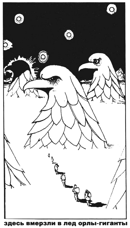 Я вздремнул; мне снилось, что я участвую в экспедиции, мы идем цепочкой по горным краям: вокруг ущелья, провалы, снежные пики, базальтовые черные скалы, удрученно вздымающиеся к белому небу. Всех нас, участников экспедиции, гложет тревога, мы идем много месяцев, лет, мы измождены, но полны решимости найти Озеро Орлов. Что за надежды мы возлагаем на это озеро — не знаю, да и разве дано узнать, что скрывается внутри твоих надежд? Мы надеемся на неведомое, но холодный ветер пронзает наши тела, и многие не дойдут до цели… Но мы находим озеро, все мы живы; оно огромно, а форма — абсолютно правильный овал, все заледенелое, а изо льда по всему пространству озера торчат головы орлов, словно толпа орлов вмерзла здесь в лед. Можно бы сказать «стая», но орлы не живут стаями. Пернатые тела с раскинутыми крыльями видны сквозь лед. Странно, но орлы — живые, об этом говорят их глаза, пылающие злобой. Спустившись на плато, мы понимаем, что здесь вмерзли в лед орлы-гиганты: каждая из орлиных голов размером с четырехэтажный дом. От голов исходит страшное зловоние, смешанное с резким запахом льда. Орлиные головы кипят от величественной злобы, но лед не тает, а мы сжались под ветром…
