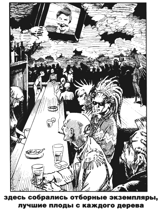 Я огляделся: место явно не вполне обычное. Людей множество, и все — представители различных субкультур. Справа от меня сидела огромная компания байкеров: видимо, им принадлежало стадо харлеев у входа. Выглядели они классически: огромные мужики за сорок в черных косухах, в кожаных жилетах на голое тело, с жирными нагими животами, в банданах, в черепах и татуировках, с длинными волосьями, с лицами страшных викингов, кое-кто в обнимку с молодыми здоровыми девками, хохочущими и орущими.