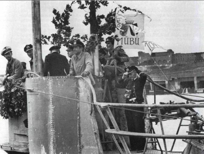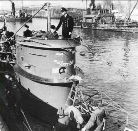 Элегантно камуфлированная лодка серии VIIC входит в один из французских портов, завершая боевой поход. Два победных флага, как это можно увидеть, развеваются на «командирском флагштоке». Эта лодка демонстрирует стандартные доработки военного времени: дополнительная выдвигающаяся штыревая антенна, которая на снимке частично выдвинута, и ее ограждение у левого борта рубки.