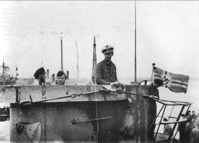 U-132 в безопасных водах у французского побережья, хорошо видно ограждение штыревой антенны. Поводом для установки этих антенн послужило возросшее расстояние, на котором действовали подводные лодки в 1942 г. На ограждении магнитного компаса греется на солнышке капитан-лейтенант Фогельсанг, один из немногих командиров, кто включил нацистскую символику в эмблему своей лодки.