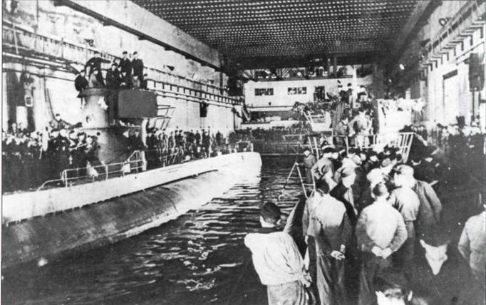 Вид на входящую в бункер лодку U-89 серии VIIC. «Счастливые времена» закончились, и многие подводные лодки возвращались без особых успехов, как и в этом случае. Толпы встречающих не заметно…
