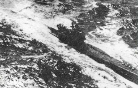 Осознавая уязвимость своих французских баз, немцы с 1941 г. начали укреплять доки и ремонтные мощности. К тому времени, когда союзники начали бомбить порты в конце 1942 г., основные бункеры были закончены, и несмотря на мощные регулярные налеты, почти не было подводных лодок, потерянных в своих базах. На фото: U-404 проходит перед рядом бункеров в одном из французских портов, на рубке еле видна эмблема в виде дракона. Перекрытие толщиной 3,6 м надежно защищала от бомбардировок. На лодке серии VIIC на носовой палубе виден один открытый контейнер для запасной торпеды.