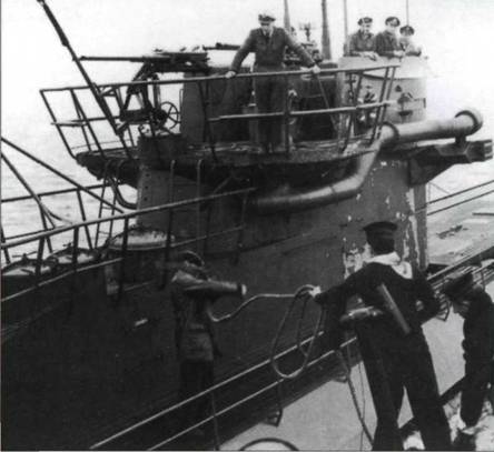 U-1009 – типичный внешний вид лодки VII серии в 1945г. Кроме дополнительной площадки для зенитного автомата видны такие модификации, как шнорхель, уложенный в свой желоб в палубе, и четыре контейнера для спасательных плотов в носовой части.