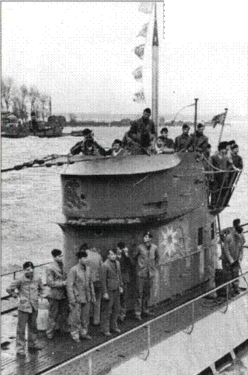 Осень 1941 г., U-124 входит в гавань после успешного похода. Теперь под командованием капитан-лейтенанта Мора, лодка несет его собственную эмблему, зеленую лягушку, вместе с эдельвейсом, как часто бывало в случае, когда новый командир принимал уже известную лодку.