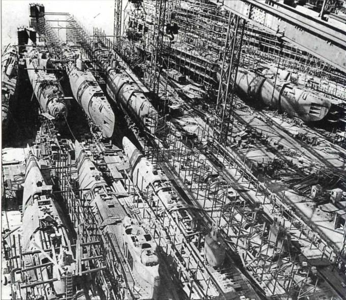 Подводные лодки XXI-й серии на стапелях верфи «Везер АГ», июнь 1945 г.