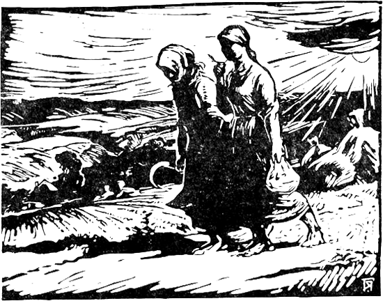 После долгого летнего дня, когда солнце садится, а горячая земля медленно снимает с себя золотые ризы, когда на бледном, утомленном за день небе проступают украдкой несмелые звезды, когда в последнем луче солнца справляют игрища мошки, а поразительно мягкий золотисто-розовый воздух принимает вдали сиреневый оттенок и делает просторы еще более широкими, еще более глубокими,— Маланка с Гафийкой плетутся по пыльной дороге, усталые, но довольные тем, что день окончился. Они несут домой горячее, как и земля, тело; а в складках одежды запах спелого колоса. Не разговаривают. Идут молча, помахивают серпами. Спина, наконец разогнутая, свободно опущенная рука, еще слегка дрожащая от длительного напряжения, мягкая пыль под ногами вместо жнивья — кажутся теперь счастьем. А дома ожидают отдых и сон, короткий, как летняя ночь, но сладостный, как прохладный лист для раны. Скорей бы домой... не ужинать, не сидеть, не разговаривать, а упасть на лавку, как камень в воду,—и вмиг смежить глаза.