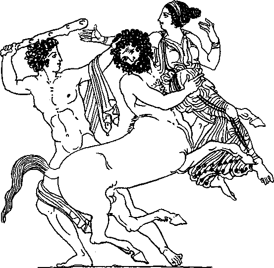 Славили гости жениха и невесту, которая сияла среди всех своей красотой, подобно небесной звезде. Весело пировали гости. Вино лилось рекой. Все громче раздавались пиршественные крики. Вдруг вскочил, опьяненный вином, самый могучий и дикий из кентавров, Эврит, и бросился на невесту. Он схватил ее своими могучими руками и хотел похитить. Увидев это, и другие кентавры бросились на бывших на пиру женщин. Каждый хотел завладеть добычей. Вскочили из-за пиршественных столов Тесей, Пирифой и греческие герои и бросились на защиту женщин. Прерван был пир, начался неистовый бой. Невооруженными пришли воины на пир. Все служило оружием в этой битве: тяжелые кубки, большие сосуды для вина, ножки сломанных столов, треножники, на которых только что курились благовония, все было пущено в ход.