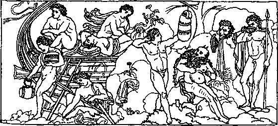 Вышли герои на берег, чтобы пополнить свои припасы. На морском берегу они увидали дом и пошли к нему. Навстречу путешественникам вышел слепой старец; он едва держался на ногах и трясся всем телом от слабости. Дойдя до порога своего дома, старец в изнеможении опустился на землю.