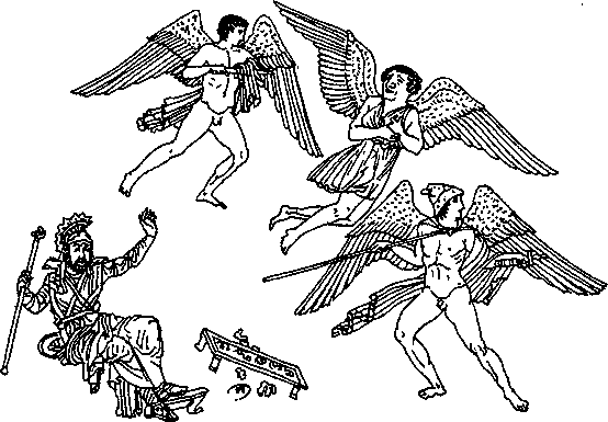 Лишь только гарпии, преследуемые бореадами (крылатые сыновья Борея — бога ветра), улетели, как аргонавты приготовили новую трапезу Финею, и старец мог, наконец, утолить свой страшный голод.