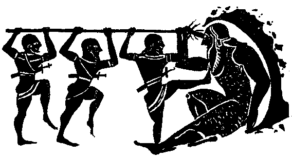 Тогда дал Одиссей знак товарищам, схватили они заостренный конец бревна, подожгли его на костре и вонзили в глаз циклопу. Заревел он от страшной боли.