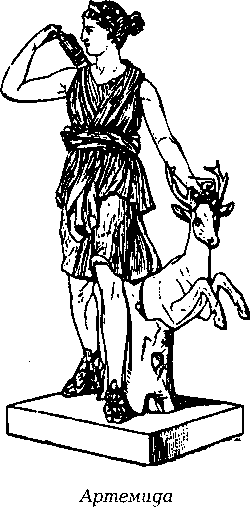 Артемида (у римлян Диана) — всегда юная дева. Она очень любила мать и брата, заботилась обо всем, что растет в лесу и в поле, а также о диких животных. Она любила охотиться и вечно носилась по лесам и полям с колчаном стрел и копьем в сопровождении любимой лани. Артемида ходила в короткой одежде охотницы, очень метко стреляла. Ее сопровождали нимфы и свора собак. Любила Артемида не только охоту, но и уединение, прохладные гроты, увитые зеленью, и горе тому смертному, кто нарушал ее покой.