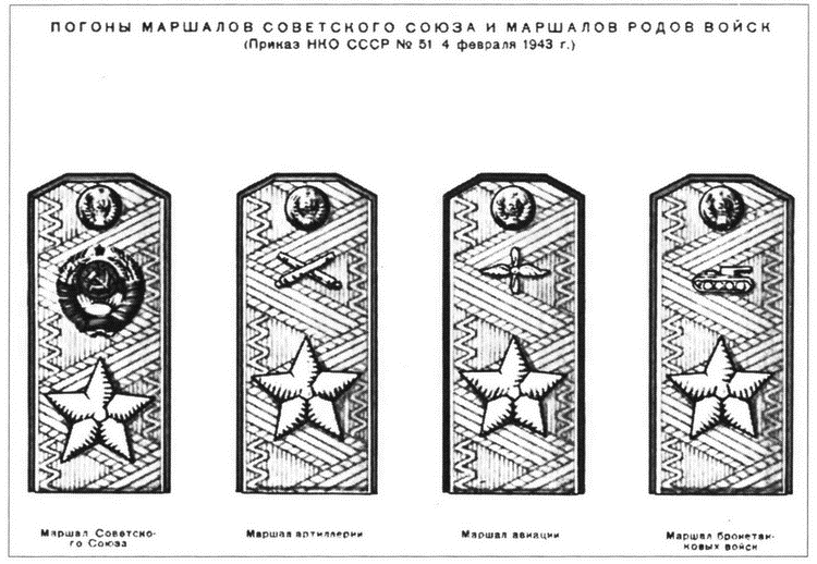 Погоны Маршалов Советского Союза и маршалов родов войск, установленные Приказом НКО СССР № 51 от 4 февраля 1943 г.