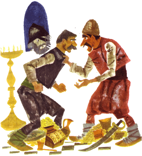 Вдруг дверь отворилась, и в церковь вошло несколько страшных-престрашных разбойников. Они высыпали на пол целую кучу награбленных денег и другого добра и стали делить добычу. Делили, делили, пока не осталась одна сабля, и тут дело дошло до ссоры: каждый хотел взять саблю себе.