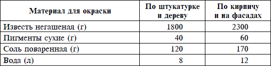 Известь-кипелка – 1500 г Соль поваренная – 100 г Пигмент по цвету – около 400 г Вода до рабочей консистенции – до 10 л
