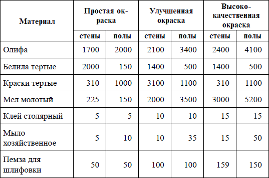 Из приведенных таблиц видно, что количество материалов, применяемых для тех или иных целей, бывает разным. В основном это зависит от качества выполнения окраски, вида поверхности (гладкая, шероховатая и т. д.), ее тянущей способности и др.